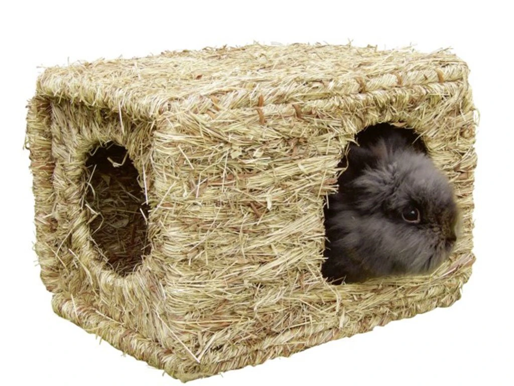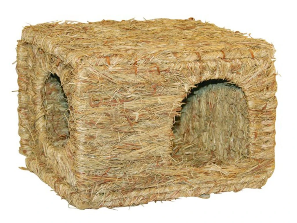 Domček pre králiky, morčatá, škrečky, činčily, osmáky s dvoma vstupmi, ručne viazaný, vhodný ako skrýša alebo preliezačka. Domček je vyrobený zo 100% sušenej trávy, a preto je vhodný na okus a konzumáciu. Rozmery 37x30x28 cm.
