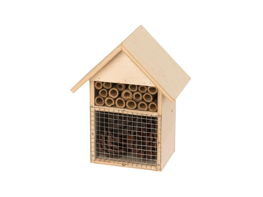 Umelo vytvorený domček pre hmyz, s rozmermi 14 x 9 x 18 cm, s prírodným výplňovým materiálom (navŕtané polienka, šišky). Domčeky pre hmyz sú veľmi obľúbené u domácich majstrov, záhradkárov a najmä u detí, ktorí sa budú tešiť na nových návštevníkov. Hmyzí hotel predstavuje ideálne miesto, kde sa hmyz môže v kľude rozmnožovať a hniezdiť. Vyhľadajú ho lienky, mravce, včely, osy a rôzne druhy chrobákov. Tento hmyz pomáha opeľovať kvety, stromy, kríky a Vaša záhrada tak bude krásne rozkvitnutá a prosperujúca. Hmyzí hotel je vyrobený z kvalitného dreva v atraktívnom dizajne, ktorý skvele zapadne do všetkých exteriérov. Domček pre hmyz bude nielen veľmi dekoratívny, ale navyše vám umožní pozorovať správanie hmyzu v jeho prirodzenom prostredí.