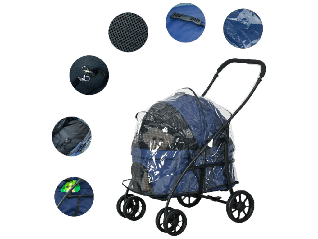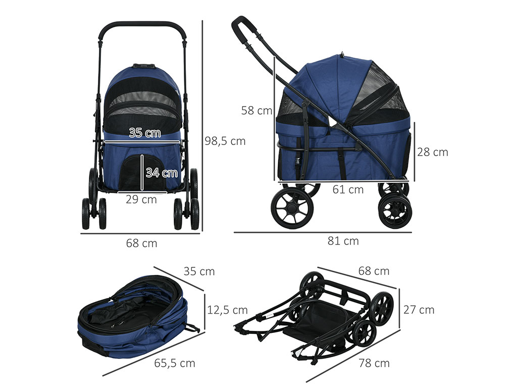 Kočík 2v1 pre psov do 10kg, tiež ako prenosná taška, s pršiplášťom do dažďa, oceľový rám, poťah z tkaniny Oxford, predné a zadné sieťované okienka, skladacia 6 stupňová strieška, sieťované predné a zadné dvierka na zips, pohodlný vankúš na ležanie, vnútri koše 2 bezpečnostné vodítka, 2 dvojité otáčacie predné kolesá EVA, 2 pevné zadné kolesá s brzdou, rozmery koša s baldachýnom 61x35x58cm, celkové rozmery kočíka 81x68x98,5cm.
