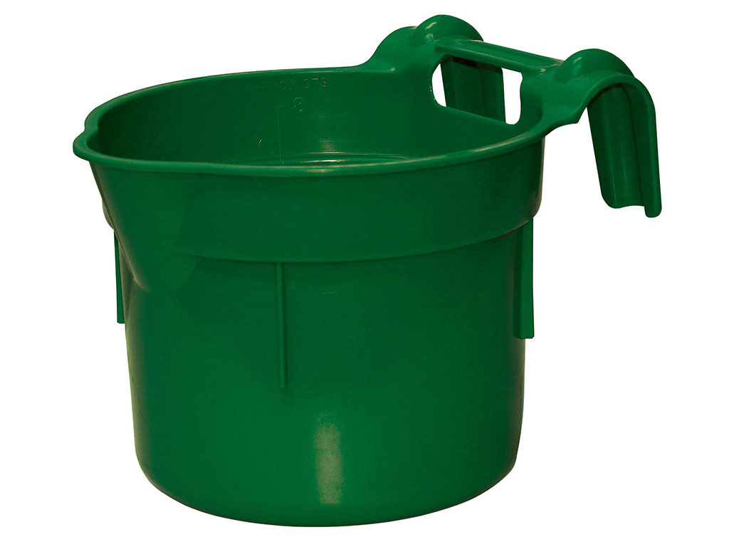 Kŕmny závesný žľab pre dobytok, z veľmi robustného a odolného plastu, praktický tvar s nalievacím hrdlom, s pevnými držiakmi na zavesenie, zavesenie do zariadenia s max. hrúbkou 40 mm, objem 8 litrov, rozmery 27x35x25 cm.