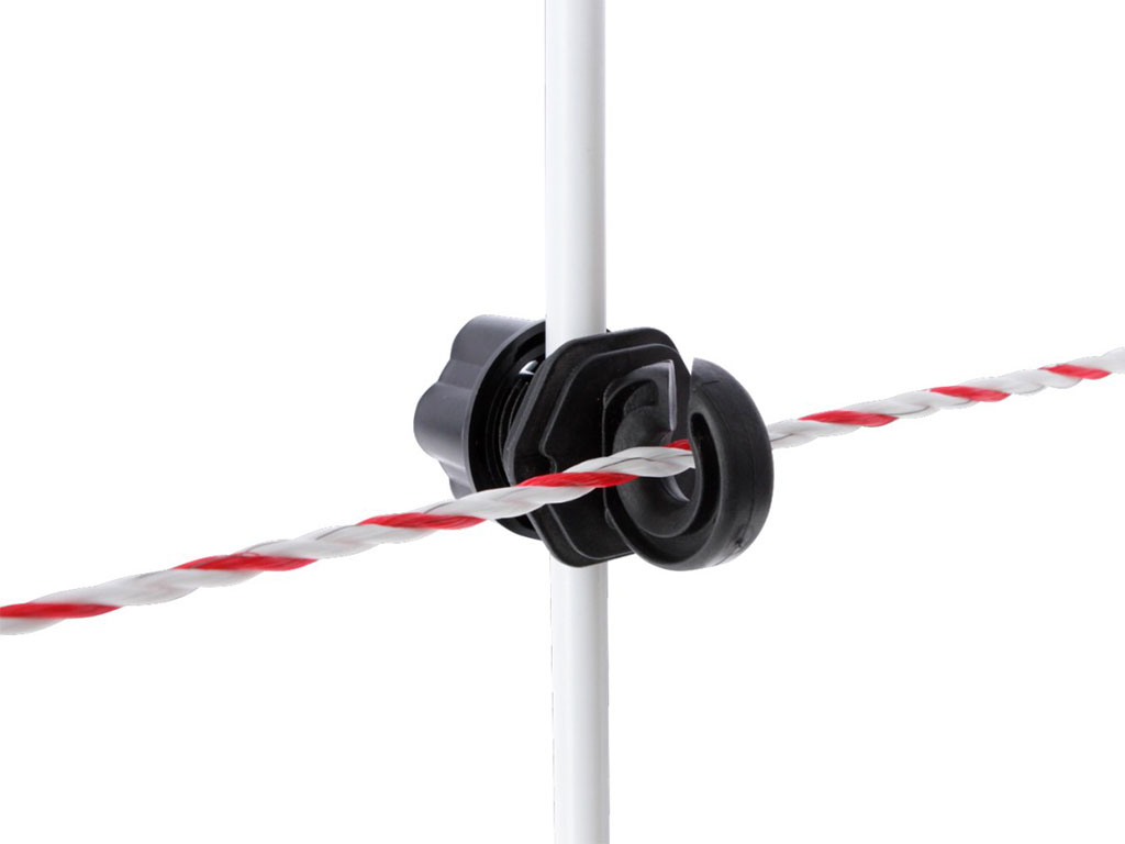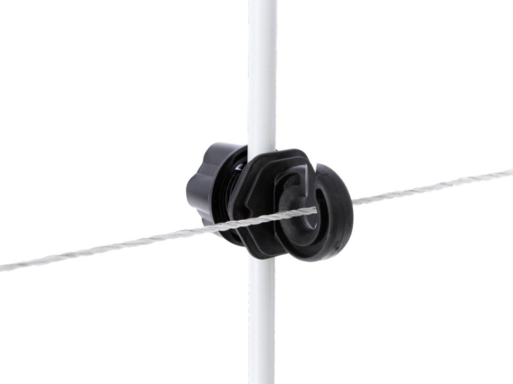 Kruhový izolátor pre elektrický ohradník, vhodný pre pásku a lanko do 10 mm, ľahké napínanie vodiča, kvalitný a odolný materiál, pre kovové a plastové stĺpiky, rýchla a jednoduchá montáž.