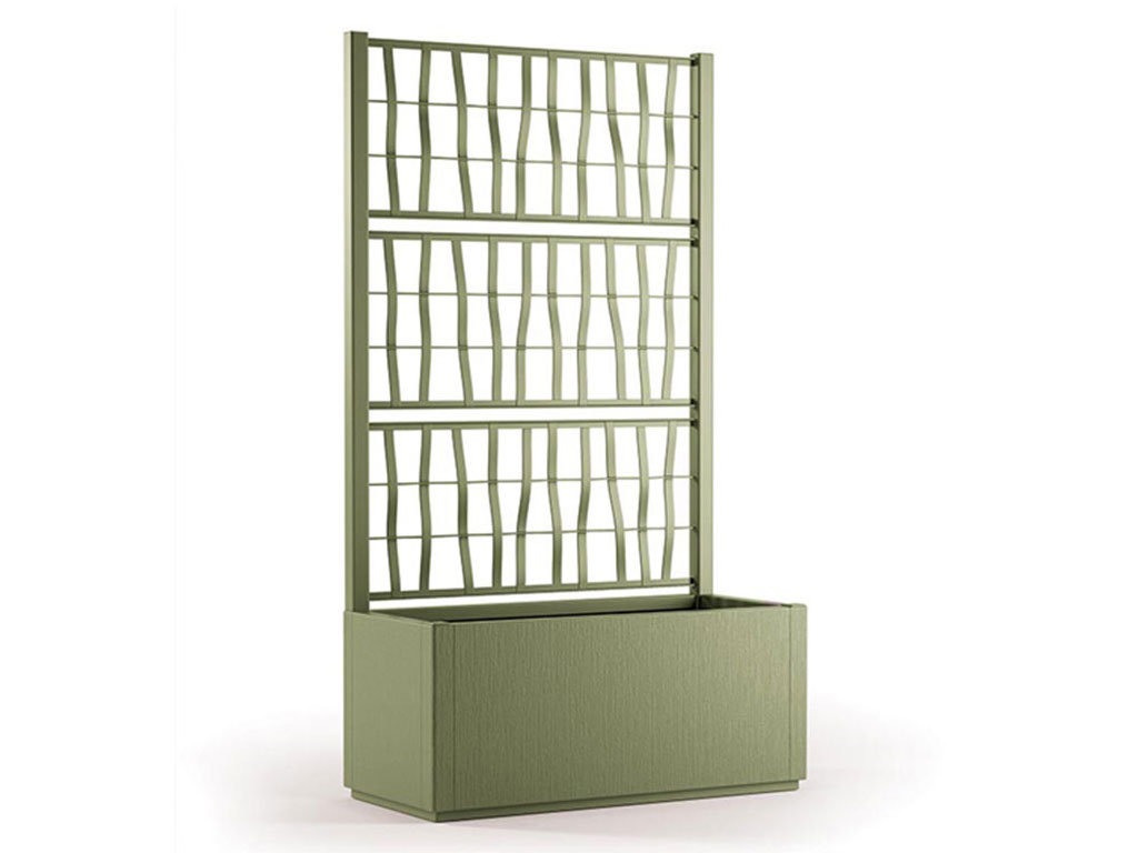 Kvetináč s mriežkou, drenážnym dnom, na vonkajšie použitie, z polypropylénu, farba olivovo zelenás objemom 80l, rozmery 80x36x142cm.