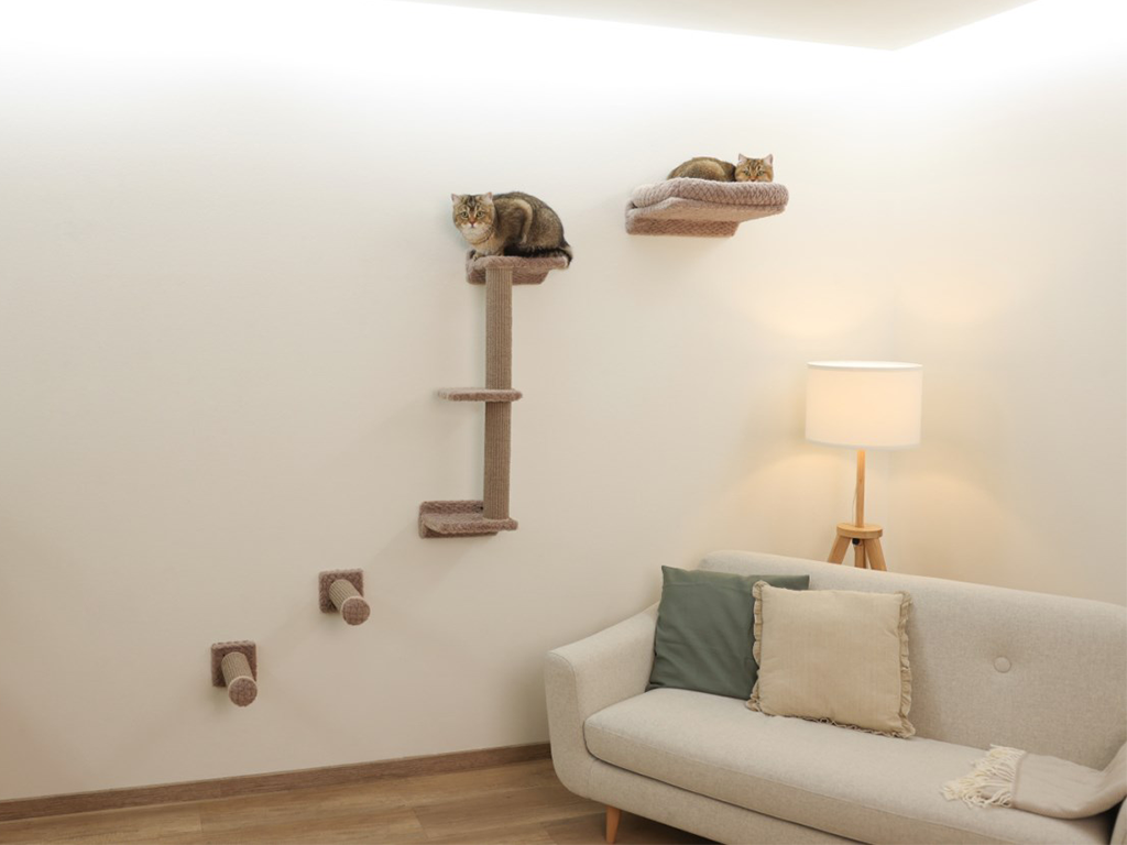 Mačacie strom na stenu, sada ôsmich častí, montáž na stenu podľa individuálnych priestorových možností, dva stĺpiky a tri stupienky, dva sisalové stĺpiky, útulný pelech na ležanie, nosnosť 10 kg.