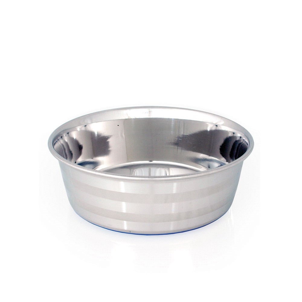 Nerezová miska zdobená o gravírované pruhy s protišmykovým silikónovým dnom v modrej farbe. Vhodná ako základná miska na vodu aj na krmivo.