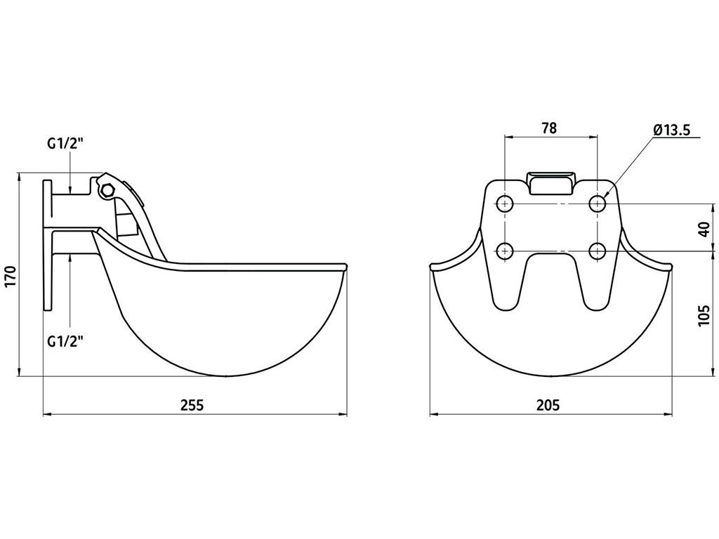 Misková napájačka, pre dobytok a kone, smaltový liatinový povrch a nerezový jazyk, pre montáž na stenu a potrubie, objem 1,45 litru, rozmery 20,5×25,5×17 cm.