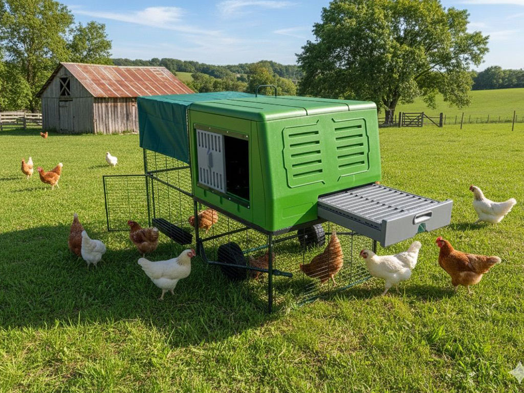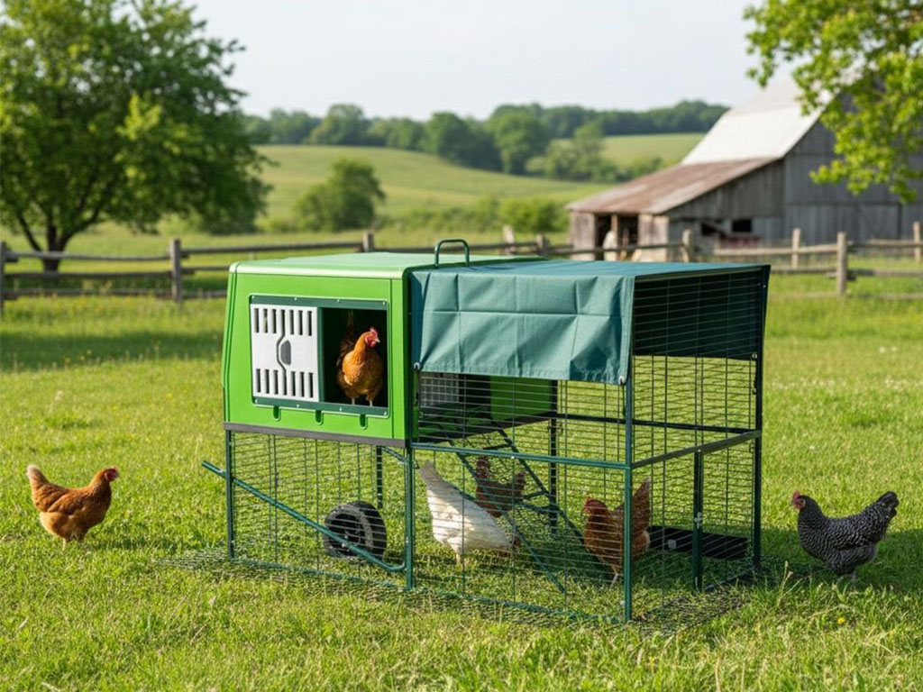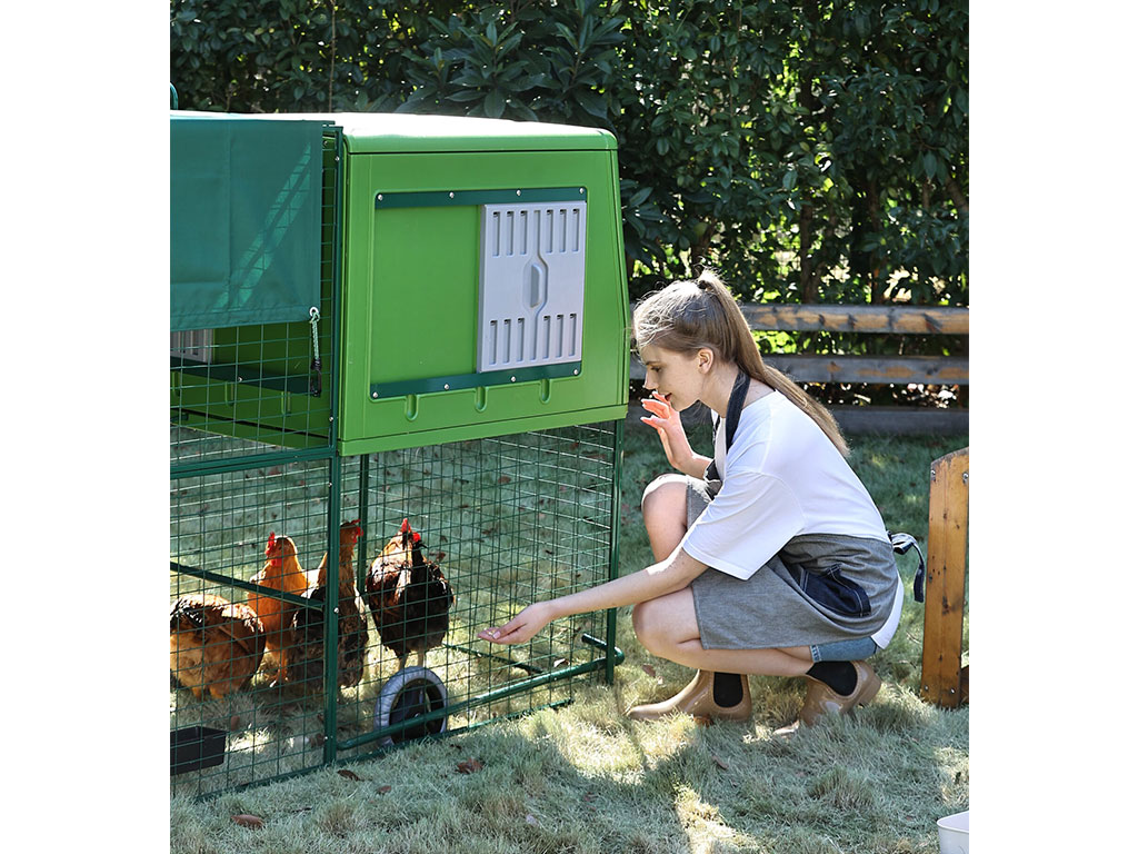 Vďaka mobilnej konštrukcii je možné kurín ľahko premiestniť podľa aktuálnych potrieb. Praktické kolieska uľahčujú manipuláciu a umožňujú pohodlný presun bez väčšej fyzickej námahy. Presun na čerstvú trávu zaisťuje sliepkam prirodzený prístup k pastve a zároveň pomáha udržiavať čistejšie prostredie. Mobilita umožňuje rovnomerné zaťaženie trávnika a predchádza jeho poškodeniu na jednom mieste. Súčasťou výbehu je aj ochranná plachta proti slnku, ktorá poskytuje sliepkam príjemný tieň počas horúcich dní a prispieva k ich pohodliu. Kurín tak ponúka flexibilné a premyslené riešenie pre záhrady aj menšie pozemky, kde je dôležitá praktickosť a efektívne využitie priestoru.