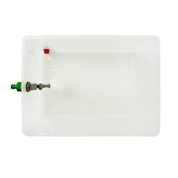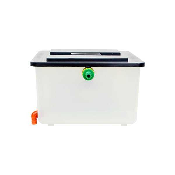 Zásobník na vodu s plavákovým ventilom, s kapacitou 20 litrov vhodný pre 72 až 180ks prepelíc. S ochranným vekom zabraňujúce znečistenie vody a umožňujúce chovateľom jednoduché dopĺňanie vody podľa potreby. Zásobník je možné tiež napojiť priamo na rozvod vody pomocou 1/2″ hadice. Stála hladina vody je udržiavaná pomocou plavákového ventilu, ktorý zamedzuje pretečeniu alebo naopak vyprázdnenie nádrže. Nádrž je vybavená tiež 1/2″ koncovkou k jednoduchému pripojenie k systému napájania. Vnútorné rozmery nádrže (ŠxVxD): 29,5 x 17,5 x 41 cm.