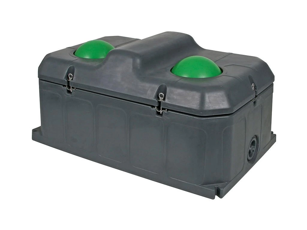 Loptová napájačka pre 20-30 ks dobytka, koní, dvojmiestna, nezámrzná s dvojitou izoláciou, objem 100l, rozmery 108,5x70x52,5 cm. Túto napájačku Vám môžeme len vrelo odporučiť, pokiaľ máte hovädzí dobytok alebo kone na pastve, pretože nepotrebuje napojenie na elektrickú sieť. Napájačka vydrží vďaka odolným plastom roky. Má skvelú dvojitú penovú izoláciu, čo sa spoločne s prúdením vody podieľa na ochrane pred zamŕzaním vody v napájačke. Plavákový ventil sa postará o automatické doplnenie vody pri poklese hladiny a spodný vypúšťací ventil Vám pomôže pri výmene vody a čistení napájačky. Vrchný kryt napájačky – veko, má dvojité tesnenie, zabraňujúce vytečeniu vody. Aby vrchný kryt napájačky tesnil ešte lepšie, má napájačka aj skrutkovací systém zatvárania. Pitie z napájačky je pre zvieratá jednoduché, postačí zatlačiť mulcom loptu a zviera sa môže napiť čerstvej vody.