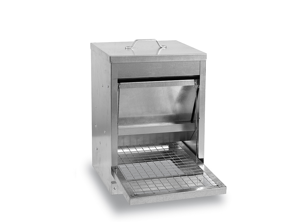 Nášľapné krmítko pre sliepky-hydinu, 5 kg krmiva, do 15 sliepok, automatické, odolné, ľahko umývateľný pozinkovaný povrch. Ak hľadáte kvalitné automatické jednostranné nášľapné krmítko, potom nemôžete vybrať lepšie. Hydina bude mať po celý deň dostatočný prístup k čistému a čerstvému krmivu a Vašou úlohou pritom bude iba nasypanie krmiva do zásobníka. Veko zásobníka má madlo pre ľahšie otvorenie tohto samokrmítka. Keď si sliepka stúpne na nášľapnú plošinu, mechanizmus otvorí veko a sprístupní jej kŕmenie. Po zoskočení z plochy sa kŕmidlo opäť uzavrie. Nášľapné krmítko pre sliepky je vyrobené zo silného pozinkovaného plechu, a preto bude jeho čistenie a údržba naozaj jednoduchá. Rozmery: 280 x 415 x 385 mm.