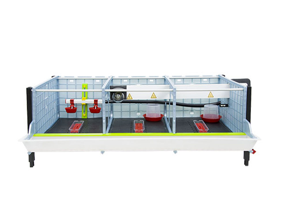 Odchovne hydiny, až 45 kurčiat, 1 poschodová klietka, regulovateľná výhrevná jednotka, kŕmiacej a napájací systém, 104x60x59 cm. Jedná sa o dokonale navrhnutú klietku k odchovu kurčiat, prepelíc, kačíc, husí či bažantov. Kuriatka budú v tejto odchovne krásne prosperovať, lebo táto 1 poschodová klietka sa 3 oddiely a výškou stropu 24cm poskytuje úplne všetko, čo hydina k svojmu rastu potrebuje. Moderná odchovňa kurčiat je vybavená výhrevným systémom s elektronickým termostatom 0-40°C a výstupom na žiarovku. Samozrejmosťou je veľkokapacitné kŕmidlo s mriežkou proti plytvaniu krmivá, napájačky s prívodom vody z 8l zásobníka a výsuvný trusník. Perfektné je, že odchovňu môžete v budúcnosti rozširovať o ďalšie poschodie. Čistenie odchovne je naozaj jednoduché, keďže odchovňa s patentovanou technológiou Comfortplast je vyrobená z veľmi kvalitného, odolného, ľahko umývateľného plastu, a bude Vám robiť radosť po mnoho rokov.