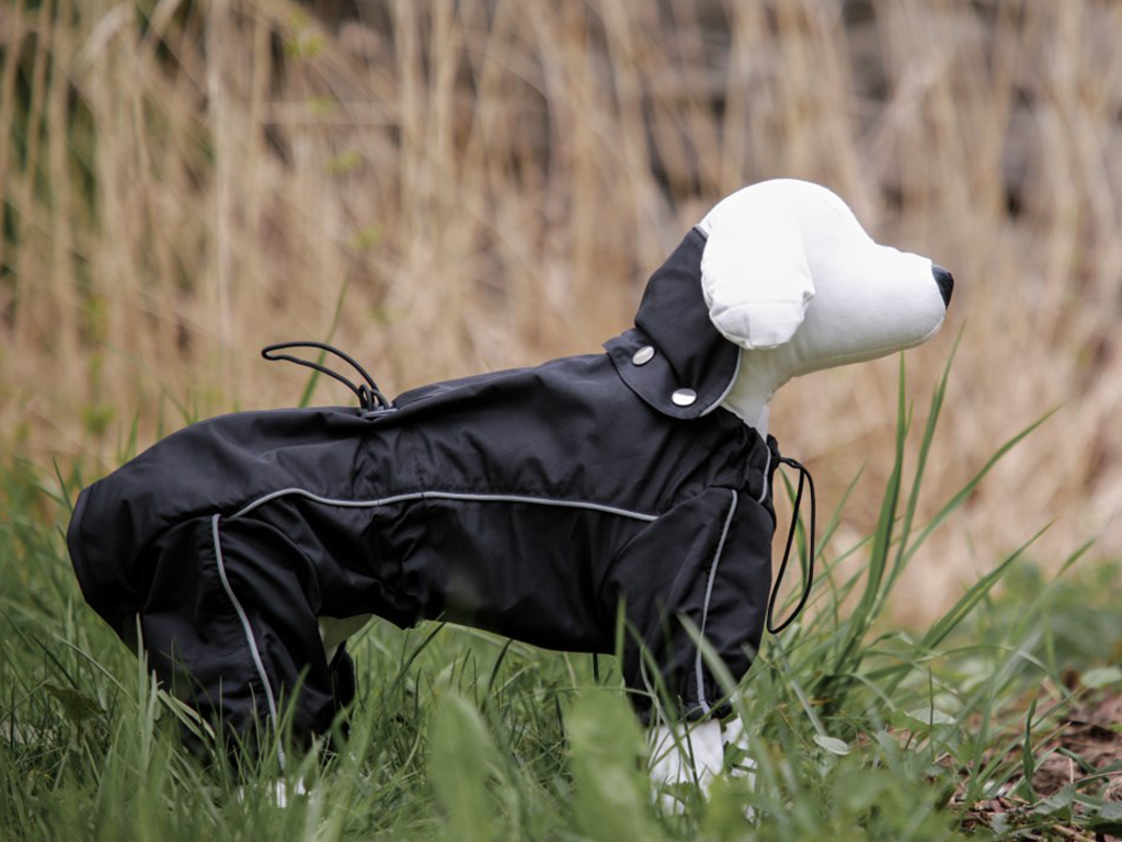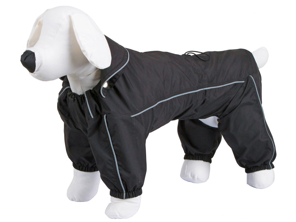 Pláštenka pre psov, odolnosť proti dažďu a vetru, so sťahovacou šnúrkou na uchytenie, odnímateľný golier, ochrana až ku každej labke, s reflexným lemovaním, obvod krku 42 cm, obvod brucha 46 cm, dĺžka tela 35 cm, dĺžka nôh 27 cm.