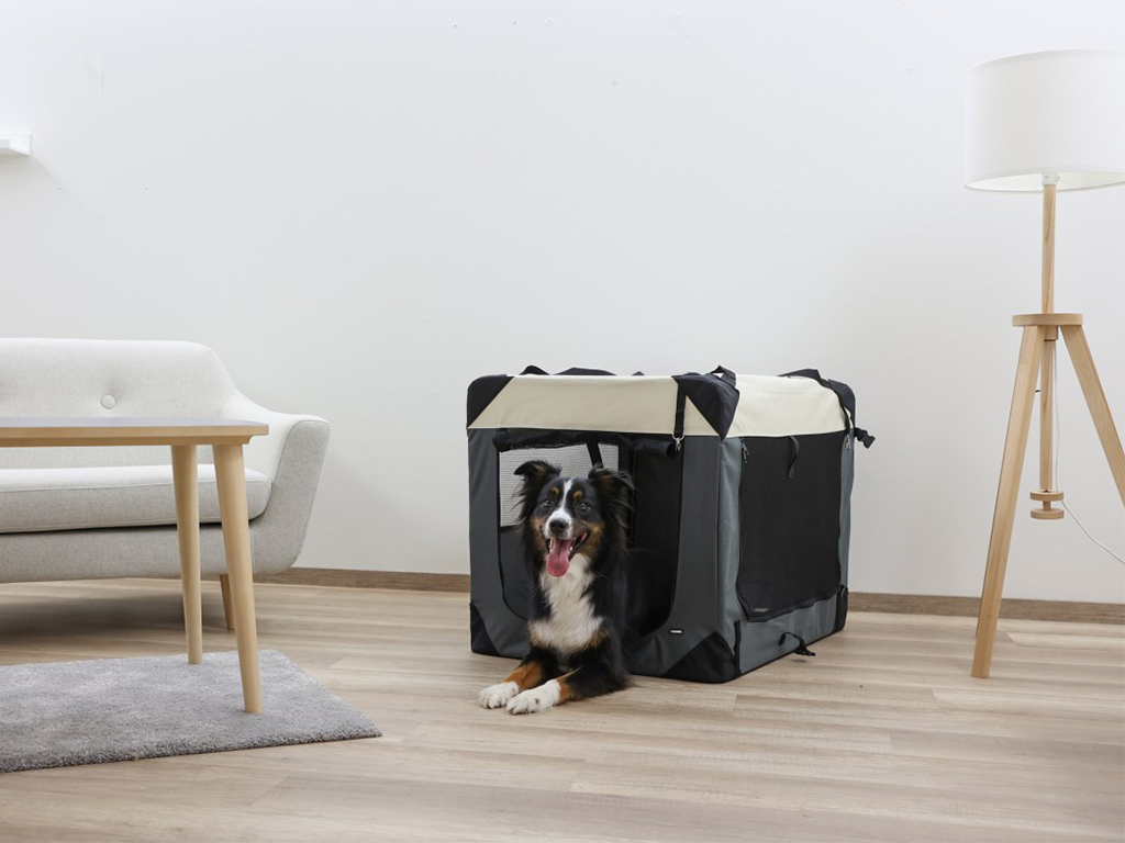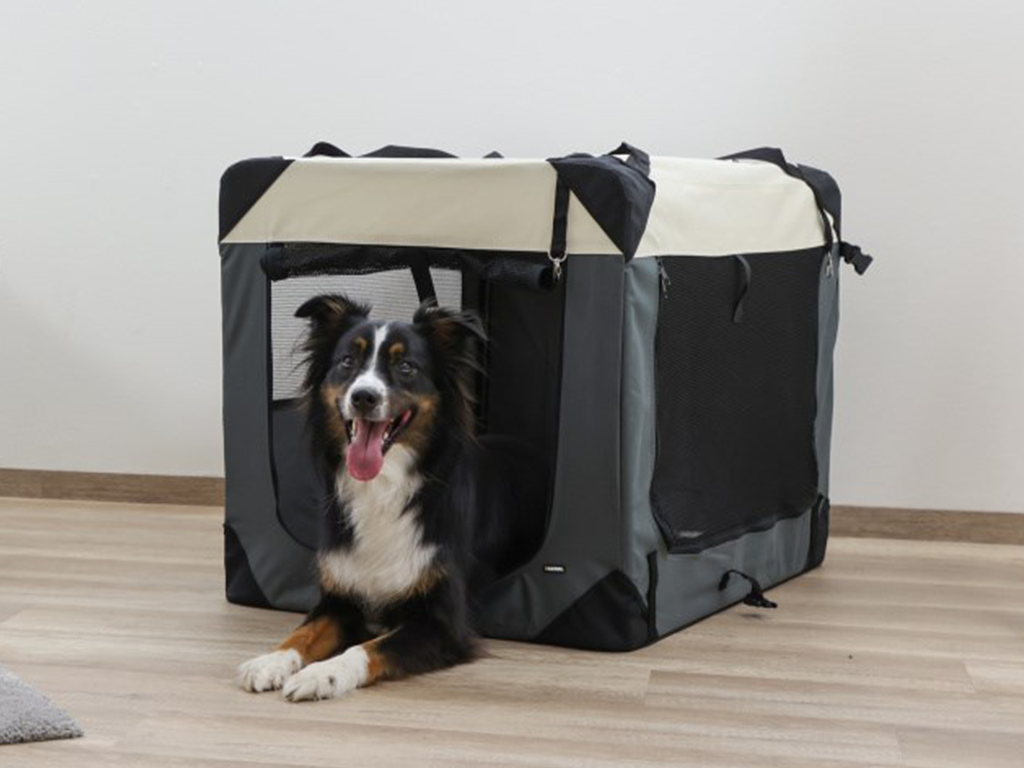 Prepravný box pre psov, z pevného umývateľného nylonu, stabilná konštrukcia pomocou kovových rámov, 3 možnosti otvárania na zips, vyberateľná vložka s mäkkým plyšom, sieťované vložky pre cirkuláciu vzduchu, bočné vrecká, držiak na fľaše, rukoväť a pútka na upevnenie pásy, rozmery 70x52x52 cm.