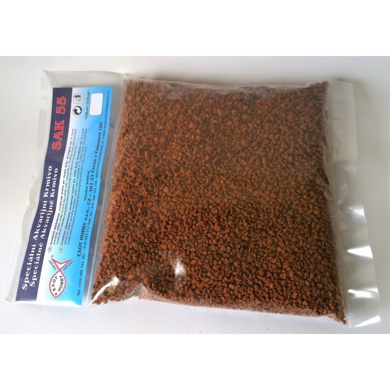 Krmivo SAK 55 je základné krmivo pre všetky druhy akváriových rýb. Vyvážený pomer rastlinnej a mäsovej zložky zaručuje rýchly rast a zdravý vývoj rýb. Toto krmivo je zvlášť vhodné pre tetrovité ryby, napr pre neonky.