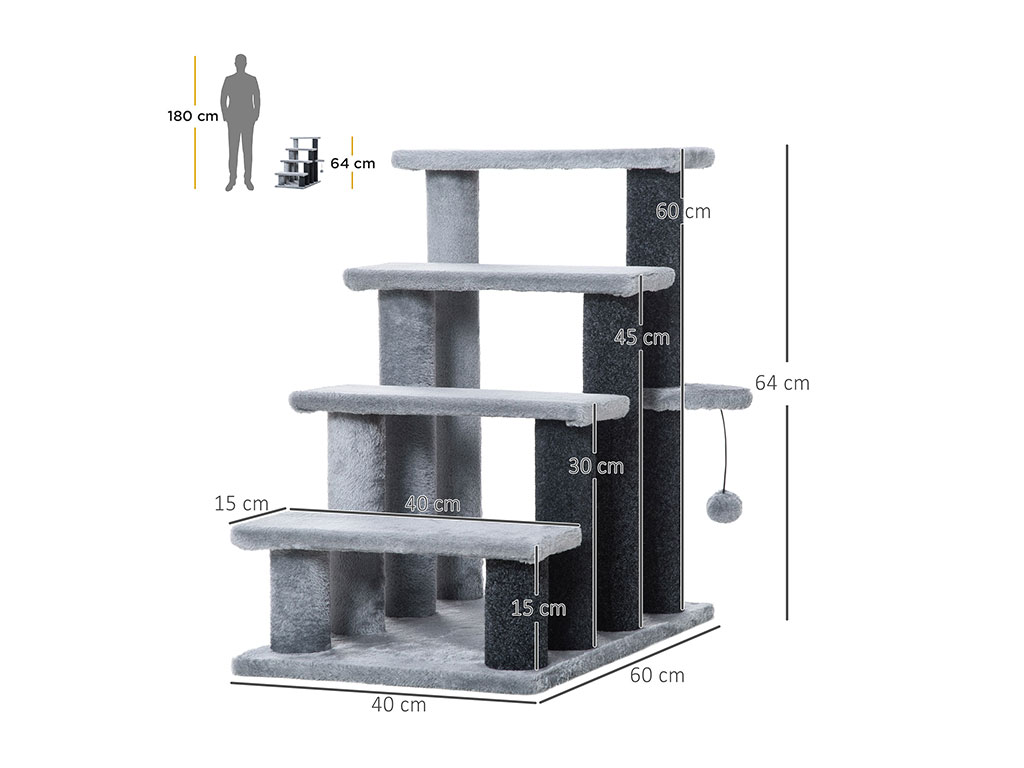 Schodíky pre psy a mačky, štvorstupňové, pre ľahké lezenie, podšité mäkkým plyšom, s mäkkou loptičkou, rozmery 60x40x64 cm. Objavte pohodlie a nezávislosť pre Vašich miláčikov s elegantnými schodíkmi, ktoré im uľahčia prístup na obľúbené miesta a zaistia ich bezpečnosť s každým krokom. Schodíky podšité mäkkým plyšom zaistia, že Vaši maznáčikovia budú mať každý krok pohodlnú a bezpečnú, zatiaľ čo mäkká loptička im poskytne zábavu. S rozmermi schodu 40×15 cm a celkovými rozmermi 60x40x64 cm sa ľahko zmestia do Vášho interiéru a prinesú praktické riešenie pre všetky malé výškové výzvy Vašich domácich maznáčikov.