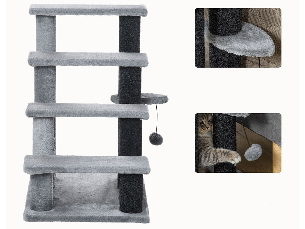 Schodíky pre psy a mačky, štvorstupňové, pre ľahké lezenie, podšité mäkkým plyšom, s mäkkou loptičkou, rozmery schodu 40×15 cm, celkové rozmery 60x40x64 cm.