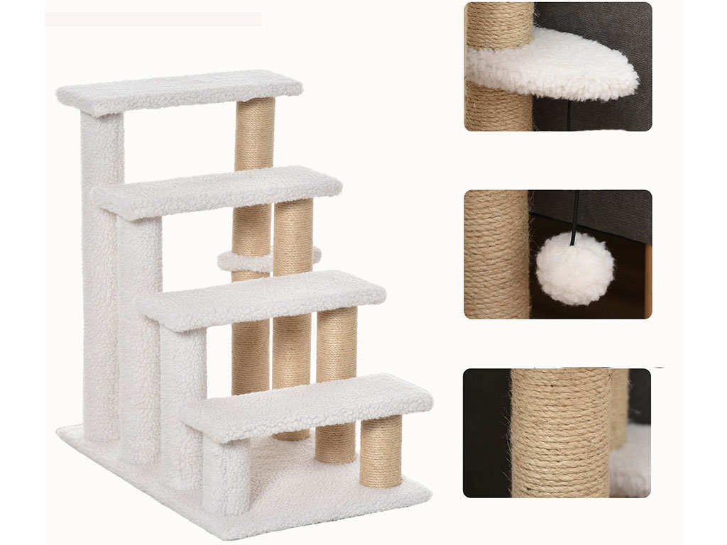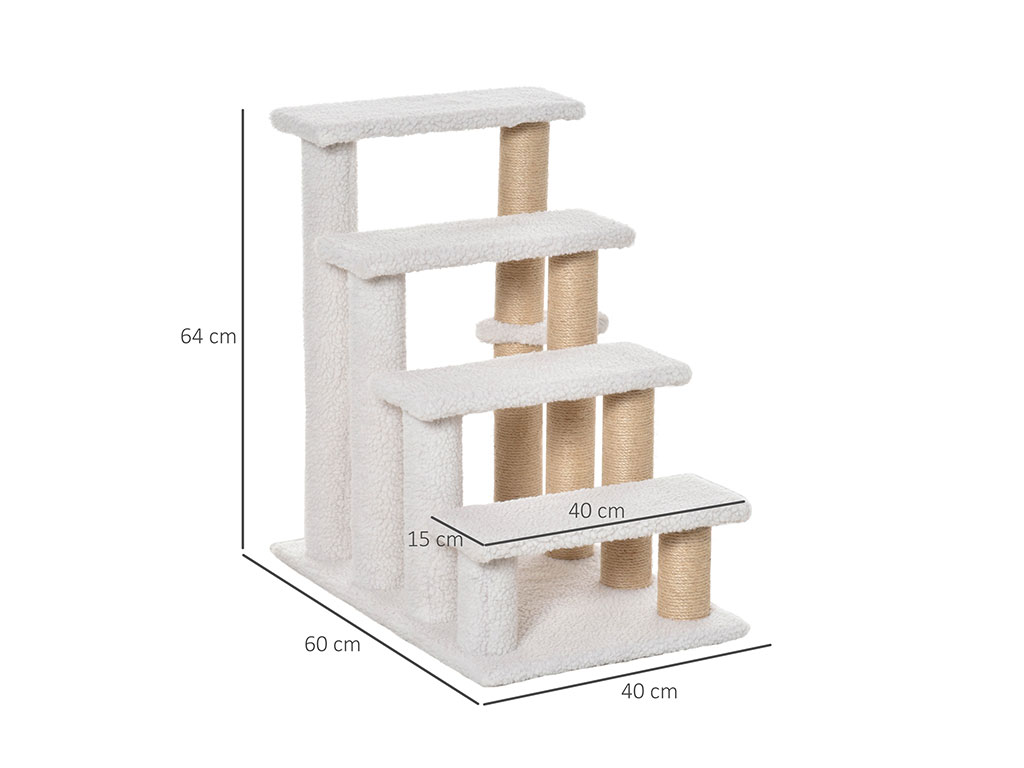 Schodíky pre psy a mačky, štvorstupňové, pre ľahké lezenie, podšité mäkkým plyšom, s odolným škrabadlom, s mäkkou loptičkou, rozmery schodu 40×15 cm, celkové rozmery 60x40x64 cm.