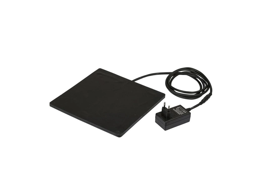 Výhrevná elektrická vykurovacia podložka k napájačkám alebo napájacím miskám proti zamŕzaniu pitnej vody, vysoká odolnosť proti vlhkosti IPx7, napájanie na 24 V priamo zo siete, spotreba 18W/h, rozmery: 24 x 24 x 0,7 cm.
