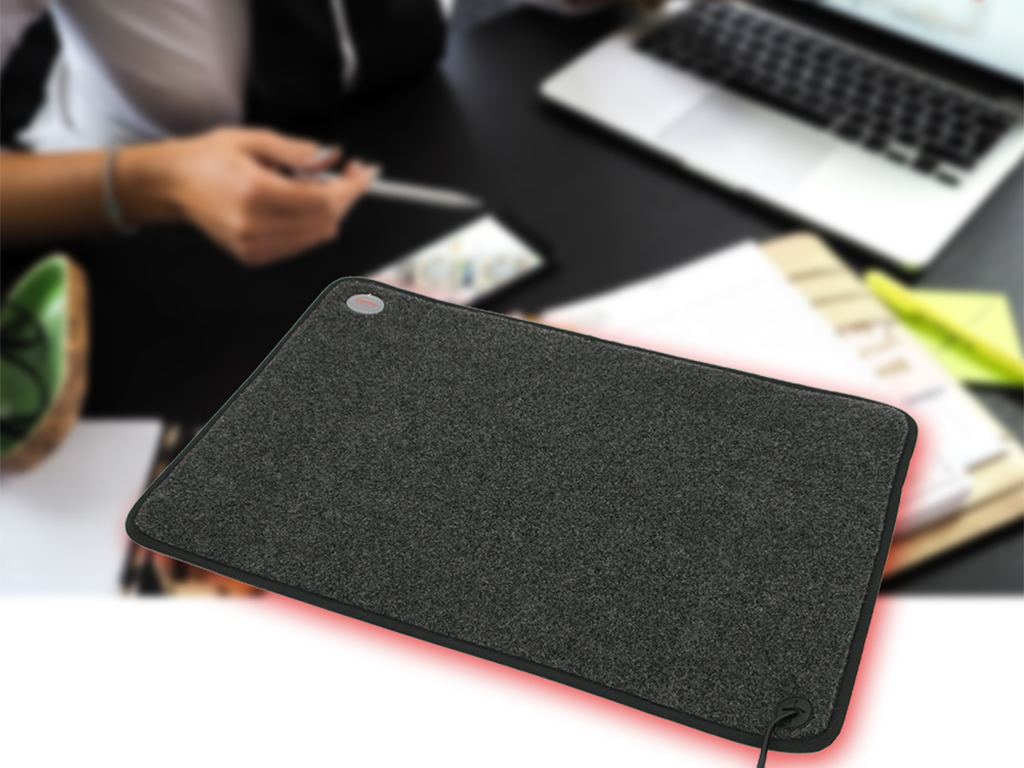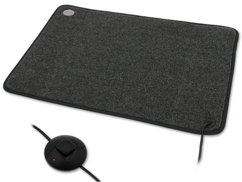 Vykurovací infračervený koberec pod nohy, s rozmermi 39x59x0,7 cm, vyrobený z odolného fleecu, s protišmykovou spodnou stranou, nízka spotreba energie – 230 V / 85 W, vysoká účinnosť výhrevu až 50-60°C, s bezpečnostným obmedzovačom teploty, vypínač s LED indikátorom, dĺžka prívodného kábla 1,7 m, trieda ochrany proti vode IP X4.