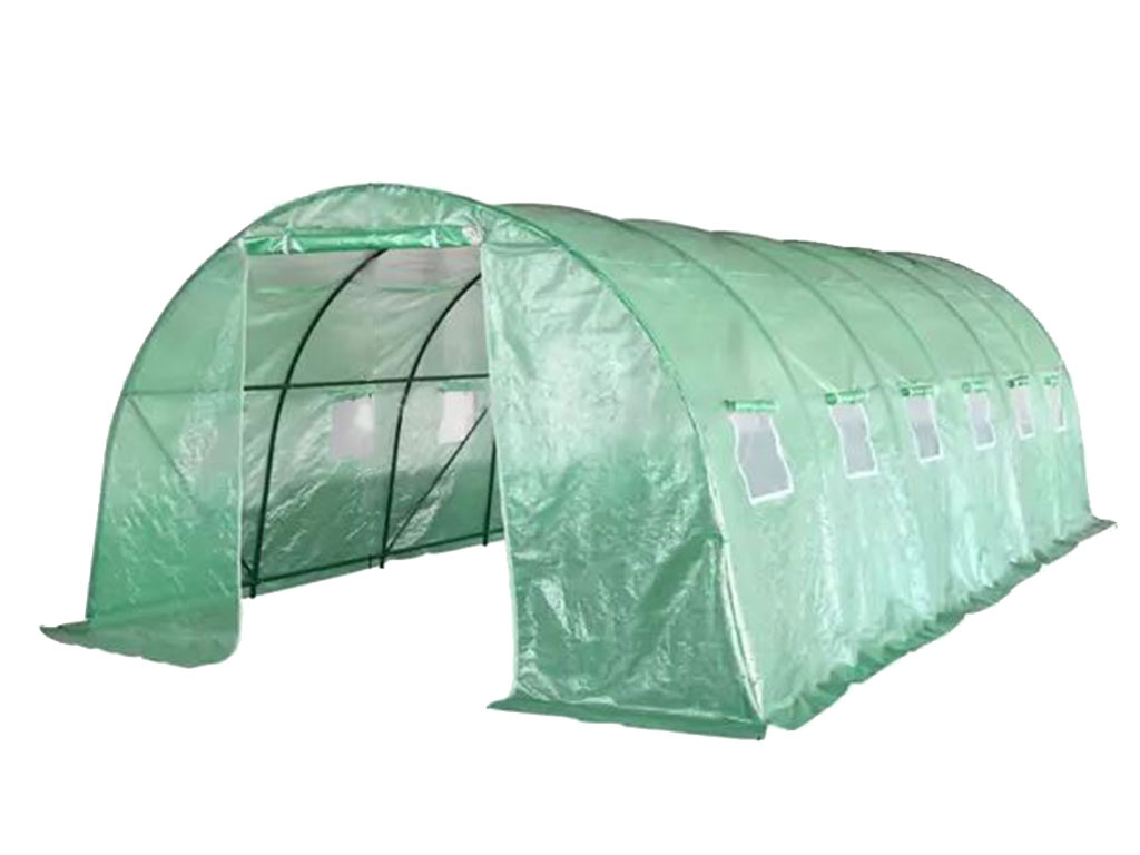 Fóliovník na pestovanie rastlín, zelená fólia s priepustnosťou 140g/m2, sklenené vlákna/polyetylén/kov, konštrukčné tyče s priemerom 25mm, 12 odvetrávacích okienok na bokoch, rozloha fóliovníka 18 m2, rozmery 600x300x2.